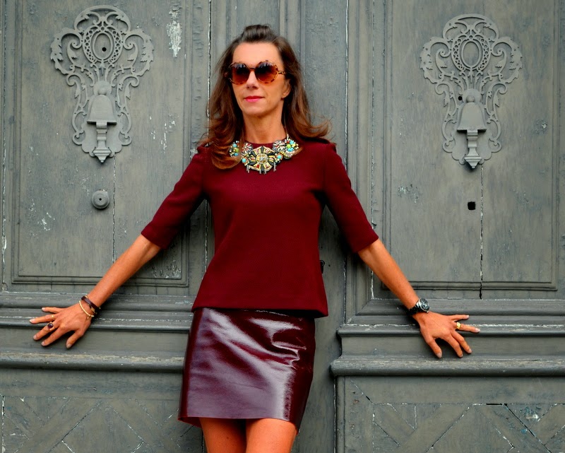 Ce bordeaux est magnifique , et quelle belle piece cette jupe, elle est faite pour toi, ce ton sur ton fait un effet des plus audacieux, c'est superbe, et le collier fini la tenue en beauté , j'adore , tu es très élégante et tes photos sont très réussies, bravo !!!